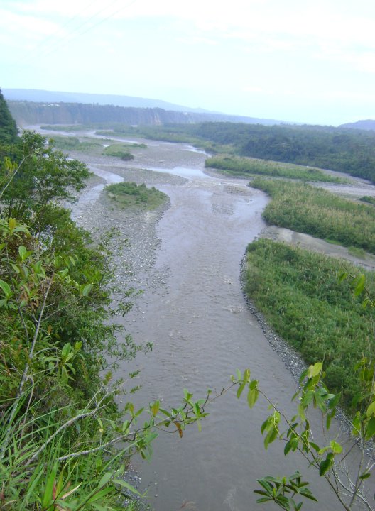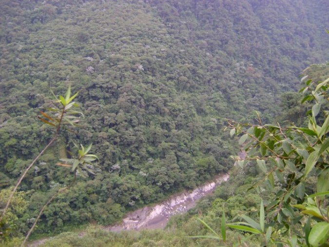 Soon, a pickup pulled over and I happily hopped in. We drove though the jungle, mountian tunnels, and paralleled a beautiful river canyon. The guy who picked me up was a good fellow, and refused to speak Spanish to me on the grounds that he wanted to practice his English. He was Carlos, from Guaranda, and he was on his way to Puyo to do some work at the local university. Apparently he’s some sort of chemistry teacher. He even stopped several times so I could take some nice pictures with my new camera of jungle-covered mountians, the river canyon, and other nice things.