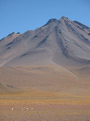 The Andes altiplano; here forms the border of Bolivia/Chile. Also, vicuñas in the foreground (relatives of the llama)