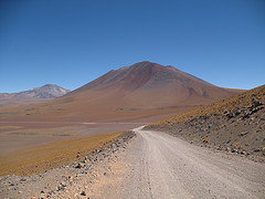 To the west was the Salar de Atacama salt flats, a vast expanse of white streching endlessly past the western horizon far out of the reach of the human eye. On either side of the road were millions if clumps of bunchgrass, scattered randomly about from the base of the mountians all the way to the salt flats.