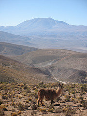 A lone Guanaco taking a meal of dry bunchgrass, his only source of food in the harsh altiplano. That's Argentina far off in the background
