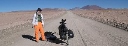 Me next to Stijn's bicycle. I am wearing almost every article of clothing I owned at the time, including the miner's pants. Behind me, about 10 km away you can see the mountians I came out of; a farther 25 kilometres back is El Laco, the iron mine