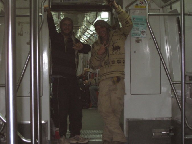 Alejandro and I on the subway in Buenos Aires after a week on the road together; neither of us had showered in at least five days, and I han't washed my pants since Trujillo, Perù. Look, you can still see some grease stains from a hamburger in Lima!