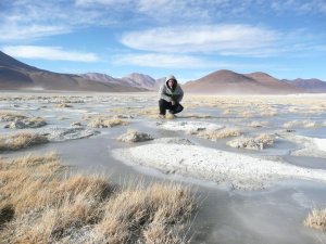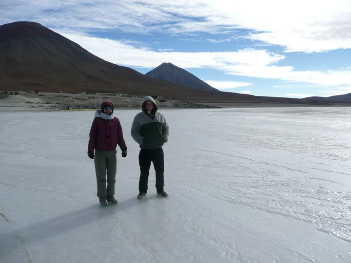 Laguna Blanco; don't worry, it's quite solidly frozen. The Volcan Licancabur is in the background on the right