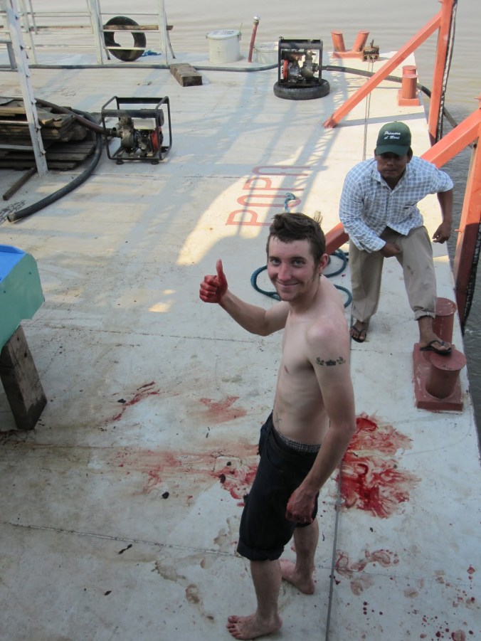 The Christina sailed constantly for four days, stopping only at night. We passed absolutely no signs of civilization, and were enjoying our river adventure. During the night, we would usually go fishing. Since fishing poles are uncommon down here, we just use a bit of fishing line, a hook, some sort of meat, and an improvised sinker (and by ‘improvised sinker’ I mean ‘washer or nut’). It was commonplace to pull sizable and colorful Amazonian catfish out of the muddy waters, some of them looking like they should have gone extinct sometime in the Precambrian-Era.