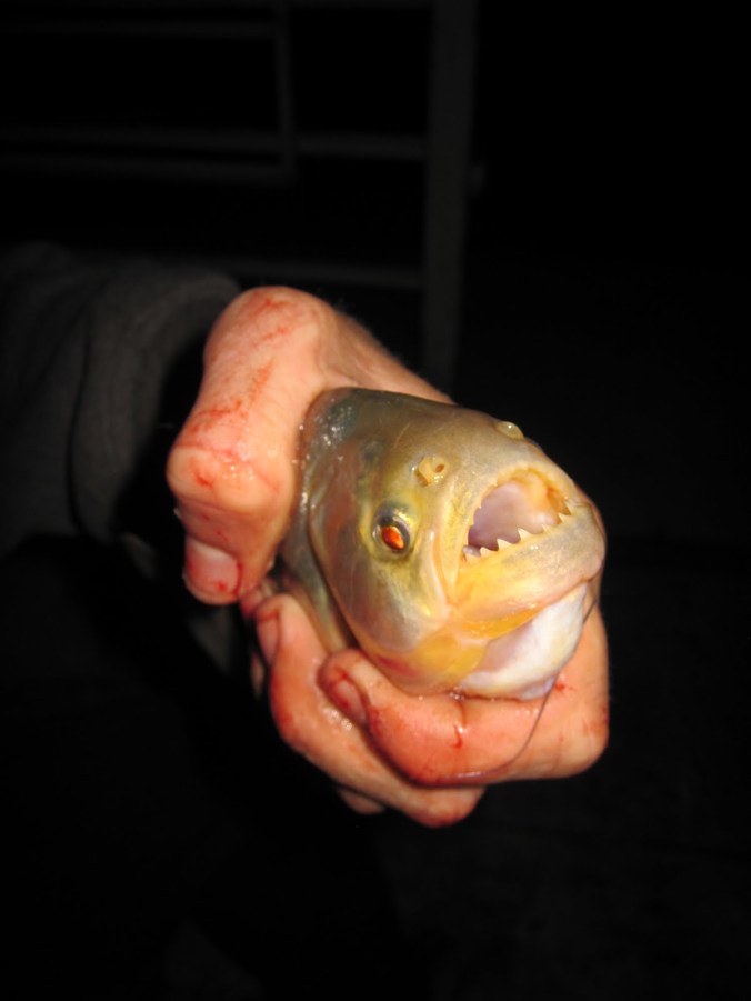 Piranhas were also common. They’re not very large fish, about 4-8 inches in length. In fact, they are nearly the same size as the perch and sunfish I used to catch in the pond back home in Texas when I was young.