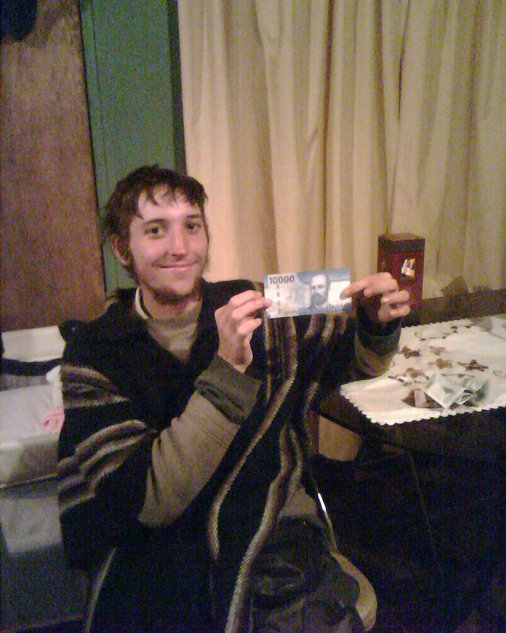 When we got to his hotel, I left the car and was getting my pack out of the trunk when Mauricio said that he had a gift for me. He handed me a wad of bills totalling CL$20,000! That’s around forty dollars! But that wasn’t the end of it; he then took a M&M mini plastic tube out of his pocket and gave it to me…and inside was 5 grams of hydroponically grown Sweet Tai. Five grams! That’s worth about $100 in the States, for those of you who don’t know. The THC crystals on the buds were so large I could practically see my reflection in them!