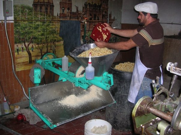 They show me how it works. There´s a big machine that grinds the corn up into dough, and another big machine that you pack the dough into that flattens it out into tortillas.